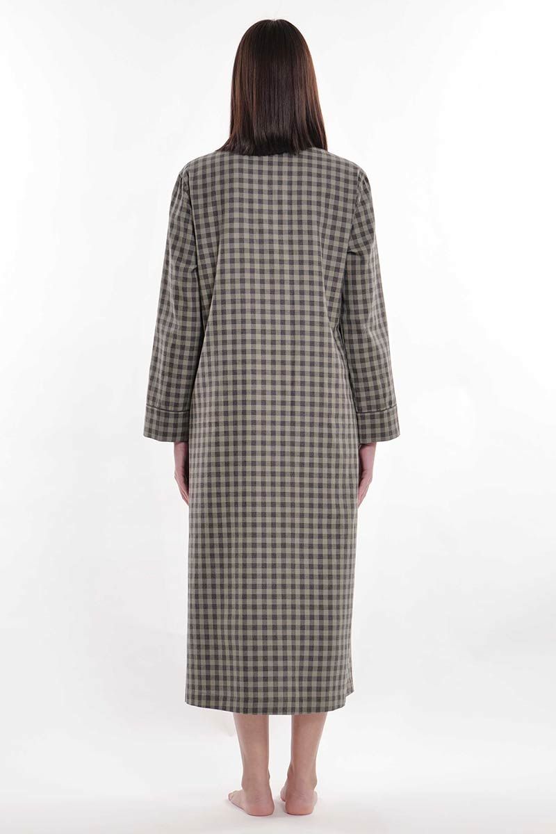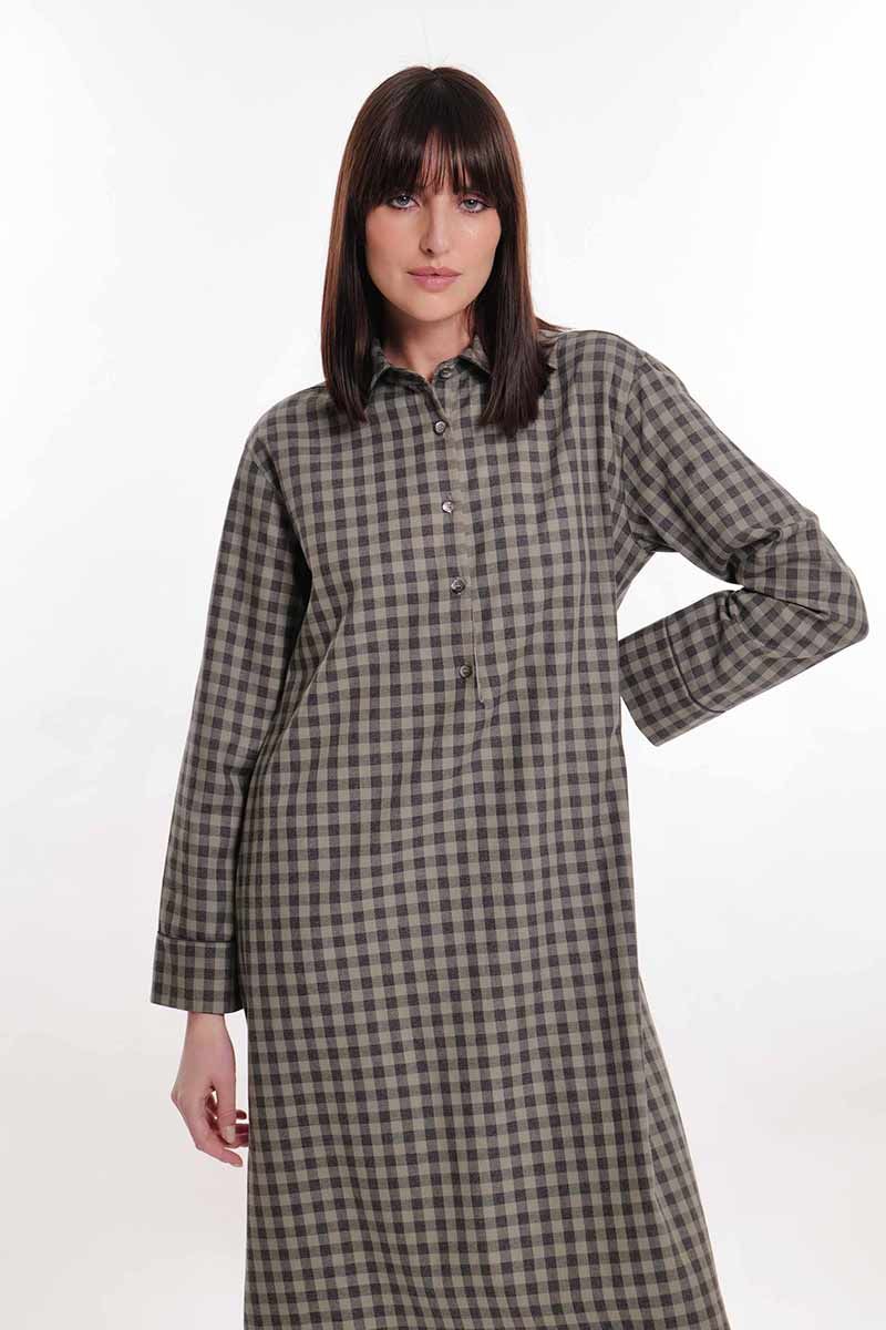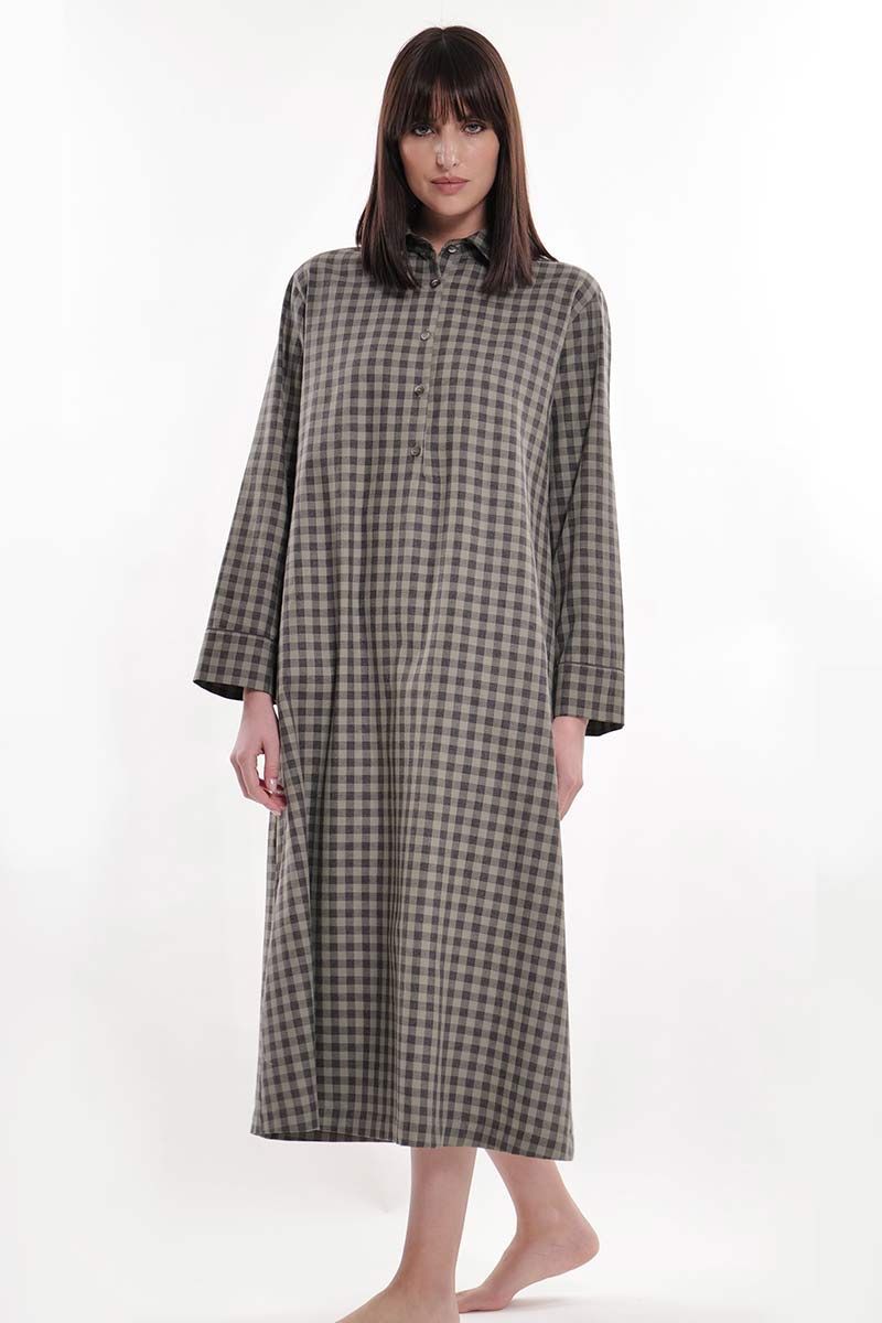 Abito in calda flanella di cotone a quadretti con apertura a 5 bottoni e comode tasche laterali. Taglio svasato, comodo e caldo per i momenti di relax.