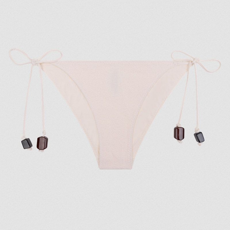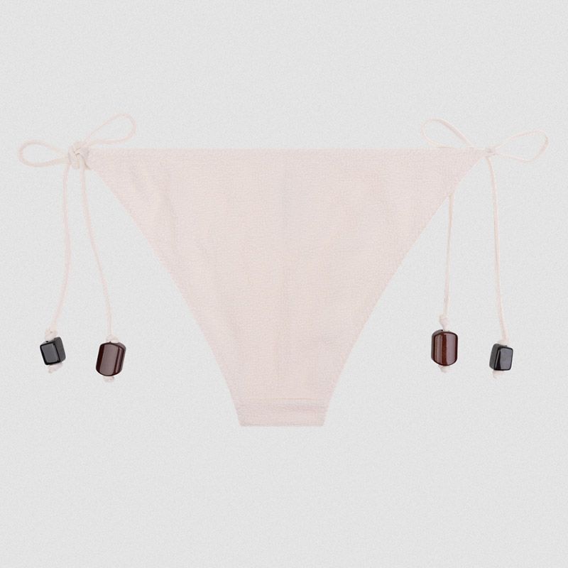 Lo slip è caraterizzato da sottili e morbidi lacci rifiniti con perline alle estremità ed è realizzato in un tessuto morbido e delicato sulla pelle.