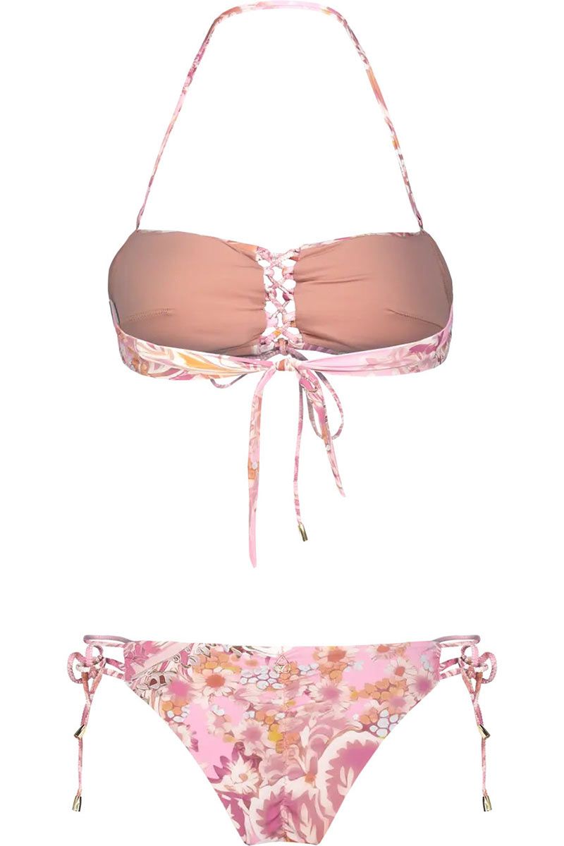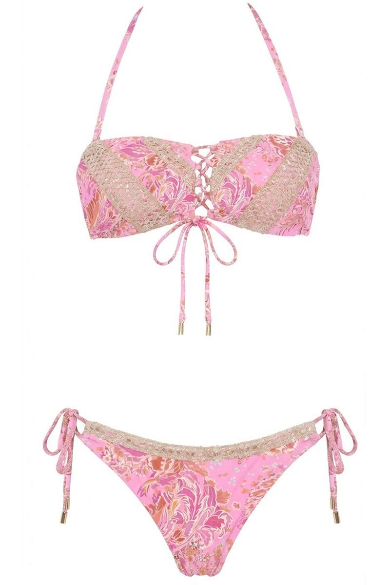 Il top a fascia con coppe removibili presenta una stampa damascata ,impreziosito da ricami ad intarsio e bordure decorative dal gusto boho. I dettagli artigianali e la chiusura frontale con lacci incrociati esaltano il décolleté con naturale sensualità.