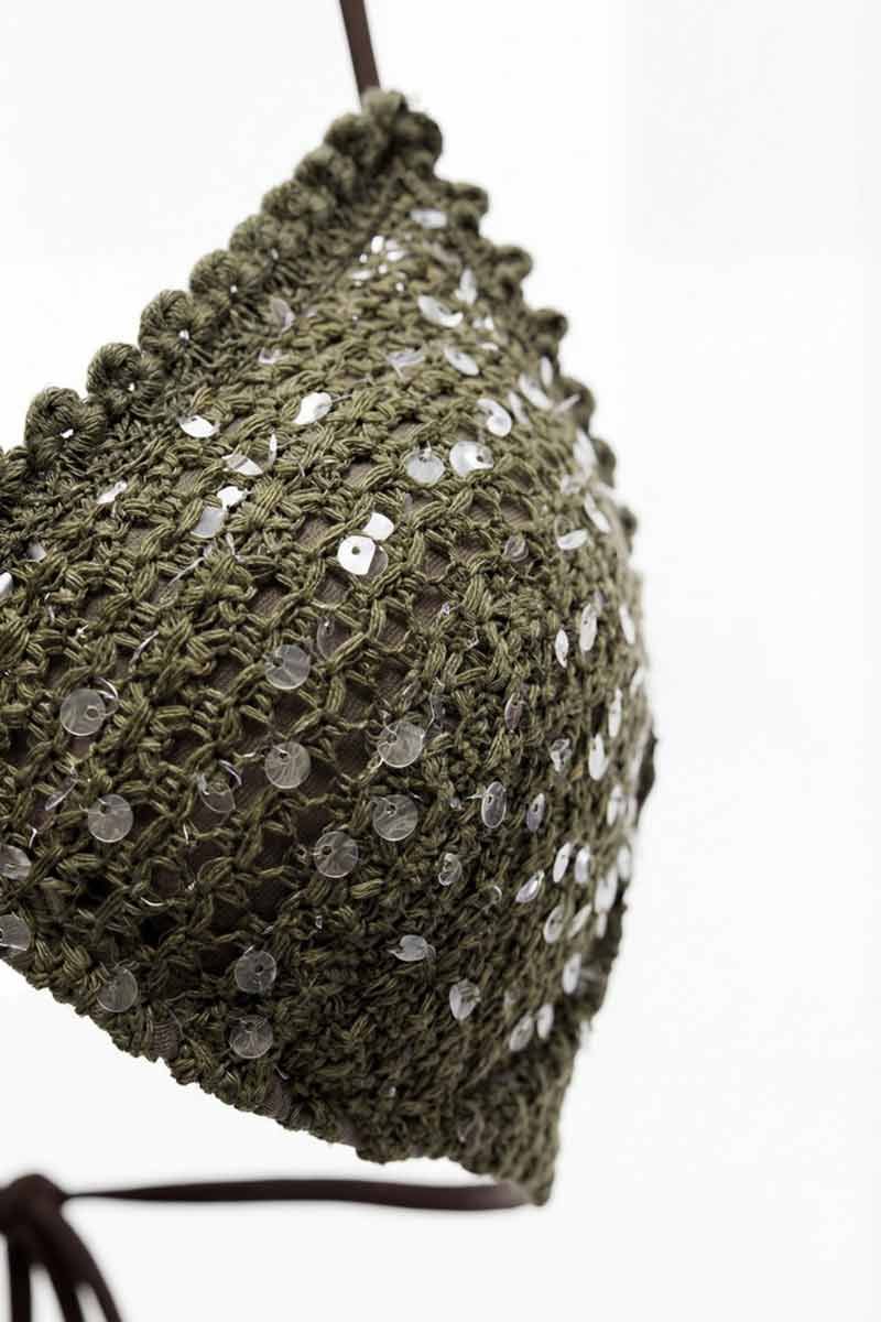 Bikini triangolo Tropical con pailettes e ricami Miss Bikini Luxe. Il tessuto in rete del triangolo è impreziosito da pailettes brillanti che giocano con i riflessi dell'acqua. I preziosi ricami lungo i bordi aggiungono una texture tridimensionale ed elegante. Grazie alle coppe removibili, il reggiseno offre un sostegno personalizzabile e una vestibilità che valorizza ogni décolleté con naturalezza e comfort.