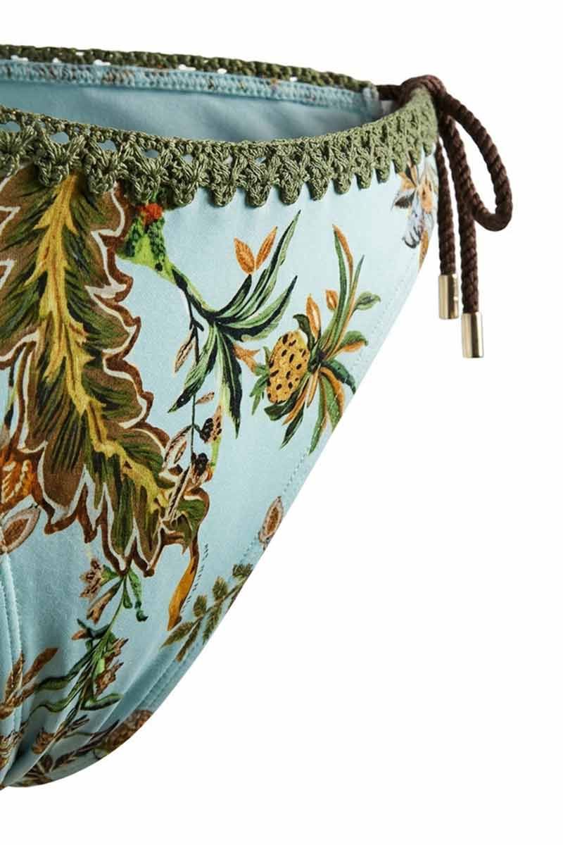 Lo slip brasiliana è caratterizzato da una vivace stampa tropicale e arricchito da ricami coordinati che richiamano il top. I laccetti laterali regolabili permettono di adattare il costume perfettamente alla propria silhouette, assicurando una tenuta impeccabile senza rinunciare alla libertà di movimento.