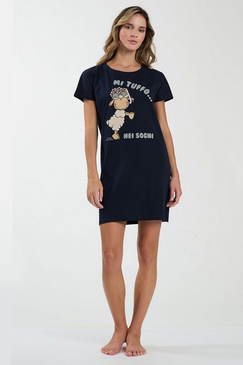 Camicia da notte blu modello mezza manica in jersey 100% cotone, fresco e traspirante. Simpatica stampa "Mi tuffo...nei sogni" sul davanti.