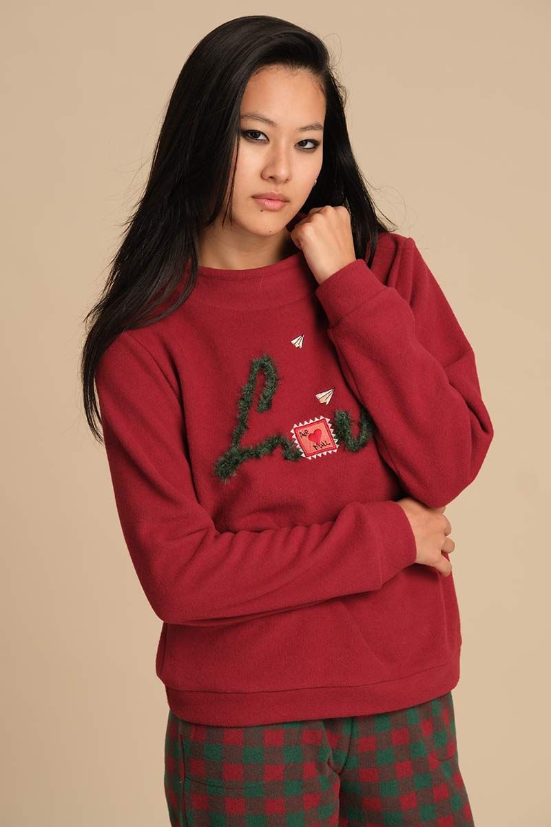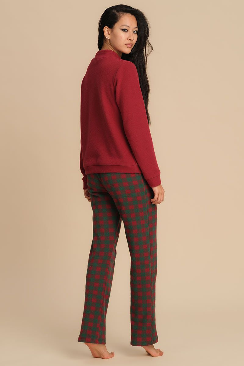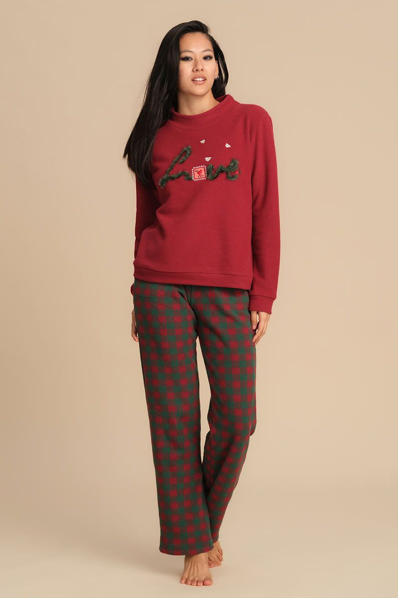 Bellissimo completo da casa con maglia tinta unita con ricamo e pantalone lungo tartan. Questo completo, chic e confortevole, è perfetto per le fredde giornate invernali in casa. La maglia rossa ha un bel ricamo con la scritta "love".