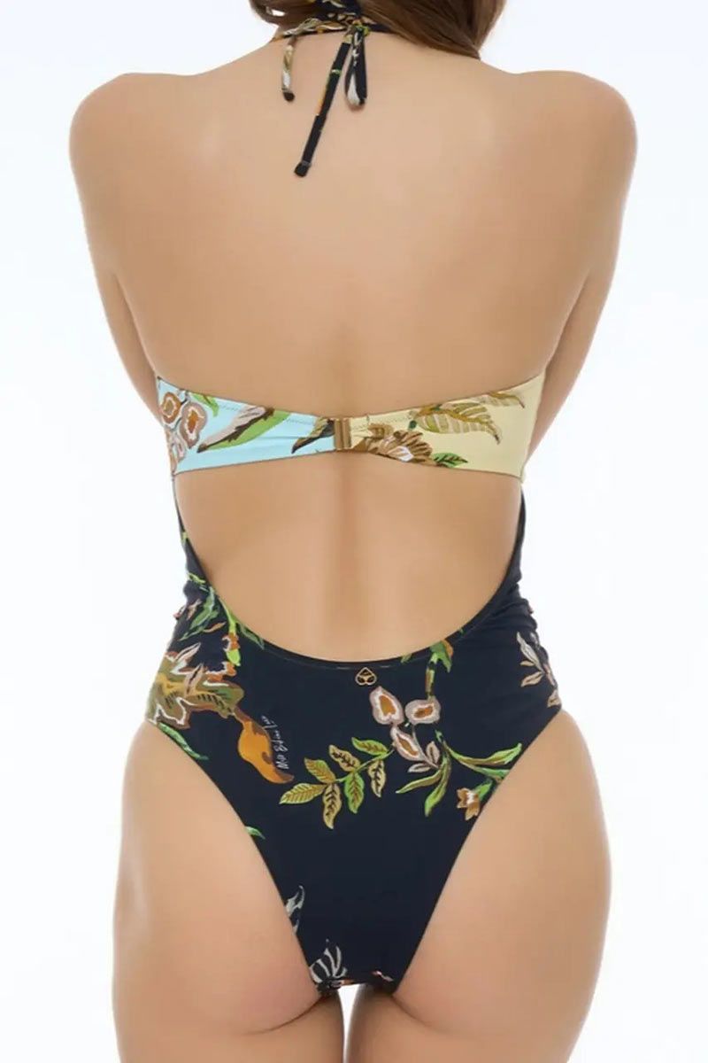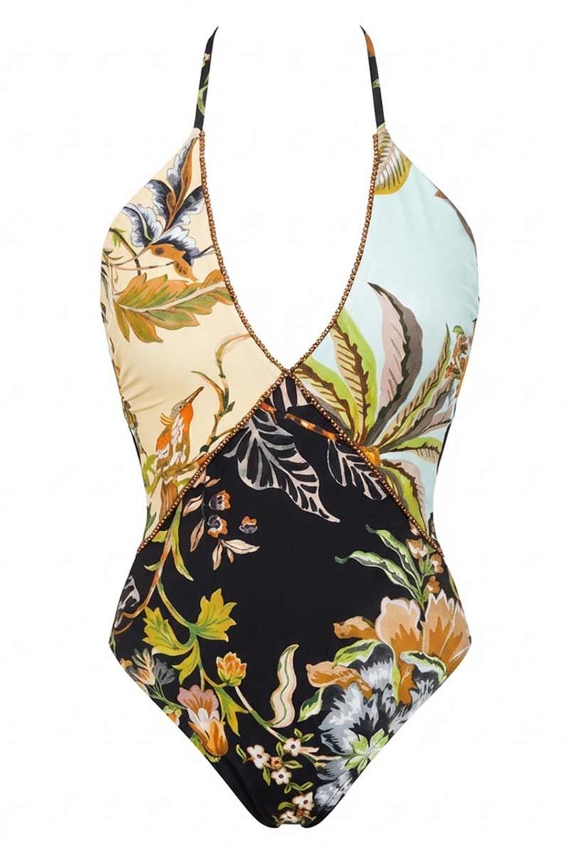 Il costume intero patchwork tropicale è un'esplosione di energia e stile ricercato. Questo intero mare cattura l'attenzione grazie alla sua vivace stampa esotica, perfetta per immergersi nell'atmosfera delle mete più lussureggianti. La scollatura è impreziosita da perline color rame che incorniciano il patchwork di stampe.
