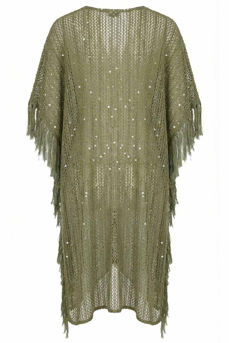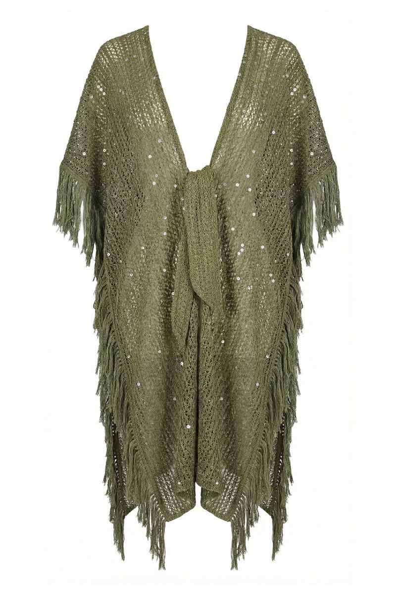 Il poncho copricostume in rete con paillettes è un capo pensato per illuminare le tue giornate estive in un resort o le serate a bordo piscina. Realizzato in tessuto effetto rete dalla texture morbida, questo kimono crea un gioco di trasparenze eleganti che lasciano intravedere il bikini in modo sofisticato. La trama è impreziosita da paillettes, delicati punti luce che catturano i riflessi del sole e valorizzano la silhouette, regalando brillantezza e carattere all'intero outfit. Le frange lungo le maniche aggiungono movimento e un sofisticato tocco gipsy, esaltandone l'anima boho-chic.