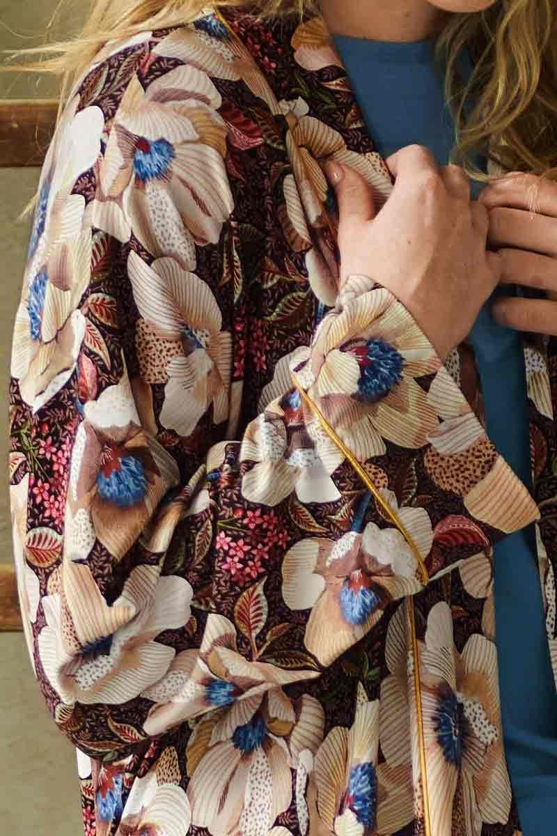 Il kimono Nisha è una scelta elegante e comoda per tutti i giorni. Questo kimono con maniche lunghe è realizzato in morbidissima viscosa elasticizzata e viene fornito con una cintura coordinata per una vestibilità perfetta. La fantasia a grandi fiori è ispirata alle stampe africane wax.