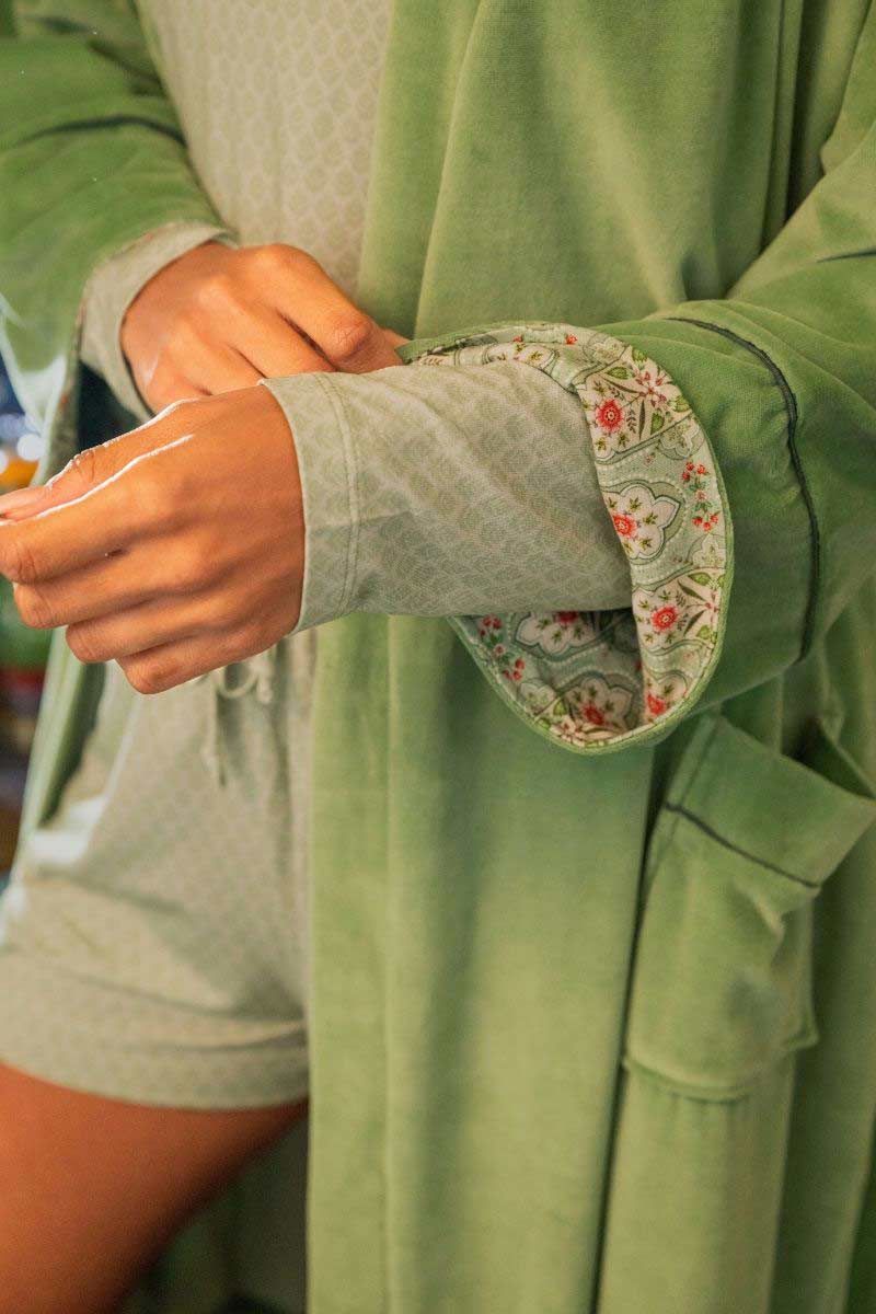 Il kimono Naomi ha una vestibilità dritta e maniche ampie. Grazie alla cintura, puoi scegliere di indossarlo morbido o leggermente stretto in vita. Realizzato in un pregiato tessuto di velluto, morbido al tatto e con una sottile lucentezza, è perfetto per serate accoglienti o per iniziare la giornata con stile.