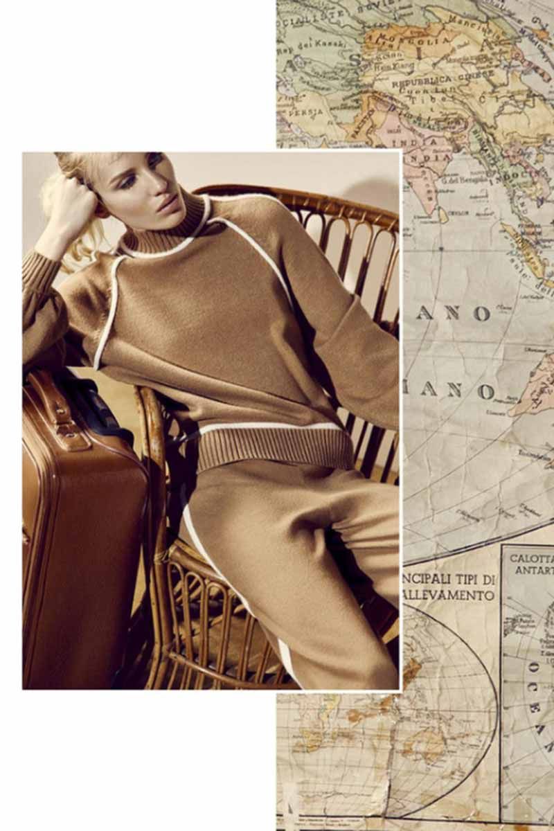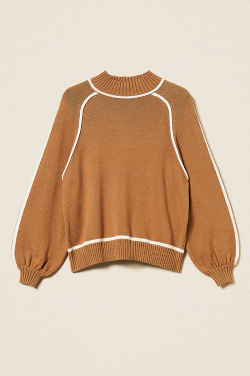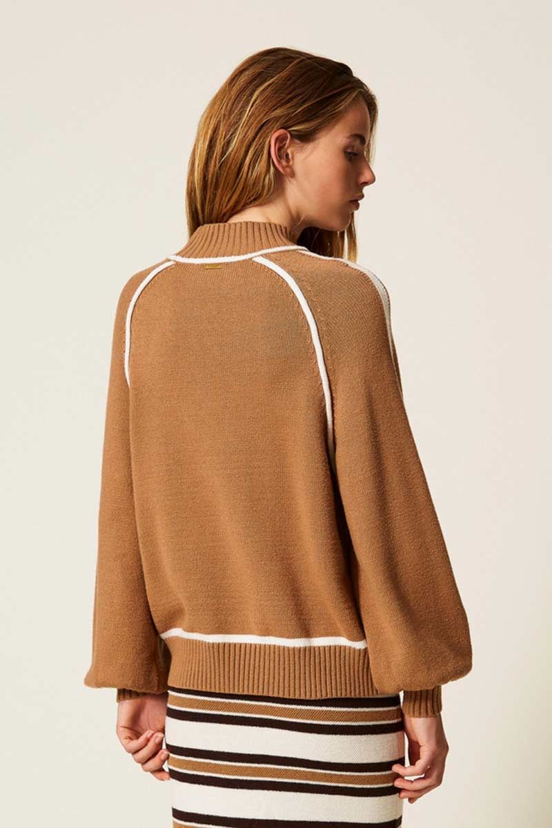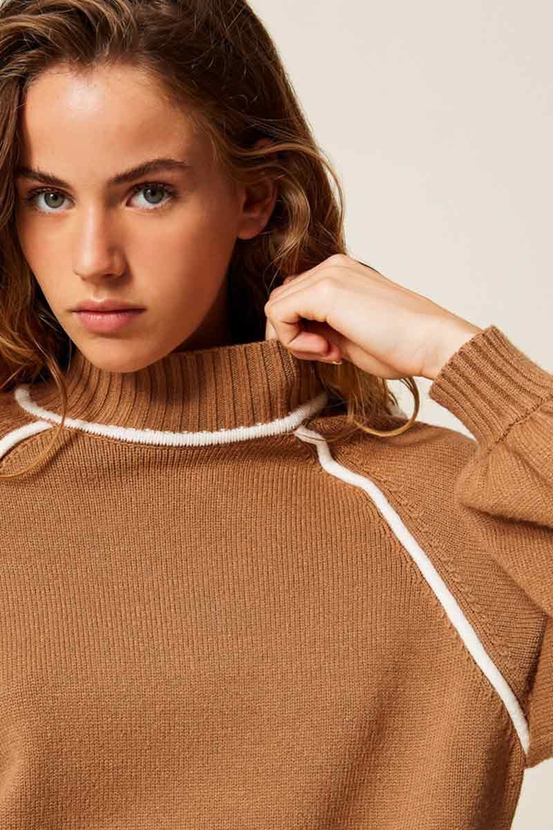 Maglia in misto viscosa con lavorazione rasata e profili a contrasto. Ha collo a lupetto, maniche lunghe morbide, profili rifiniti a costine, placchetta logo in metallo sul retro, linea morbida.