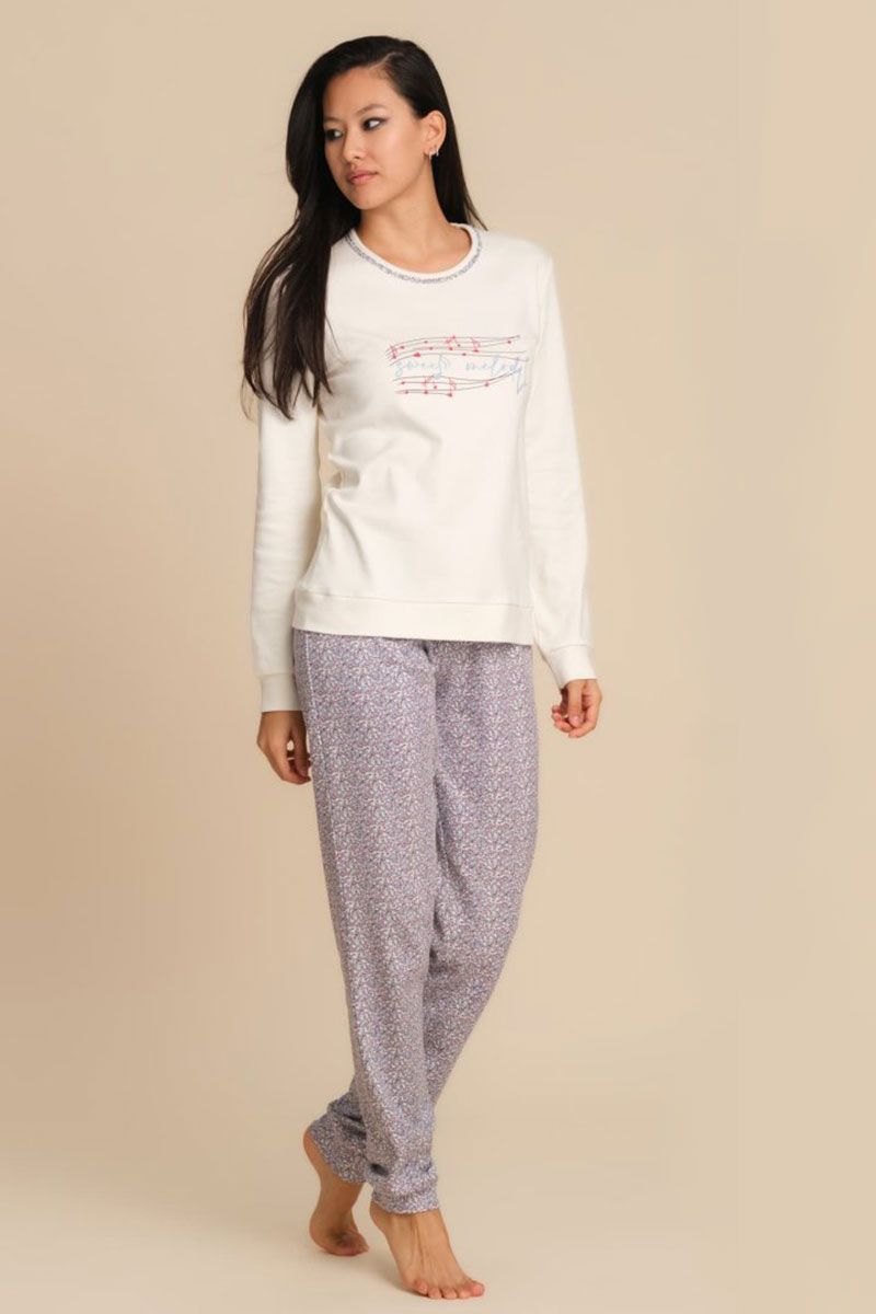 La maglia a maniche lunghe tinta unita è impreziosita da un ricamo grande con la scritta "Sweet Melody", il pantalone lungo con polsino è interamente decorato da una dolce microfantasia di cuoricini. Realizzato in caldo cotone interlock, questo pigiama è ideale per la stagione invernale perché trattiene il calore corporeo avvolgendo la pelle con una piacevole sensazione di morbidezza, senza rinunciare alla naturale traspirabilità del tessuto. La qualità del cotone lo rende resistente e confortevole, perfetto per accompagnare i momenti di riposo e di relax in casa.