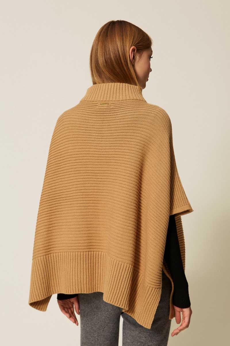 Poncho in maglia a coste orizzontali e verticali con collo in piedi, chiusura con zip, maniche a kimono, placchetta logo in metallo sul retro, linea morbida.