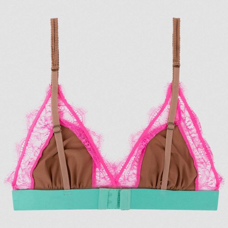 Delicata reggiseno a triangolo in marrone e rosa fluo in morbido raso e pizzo floreale