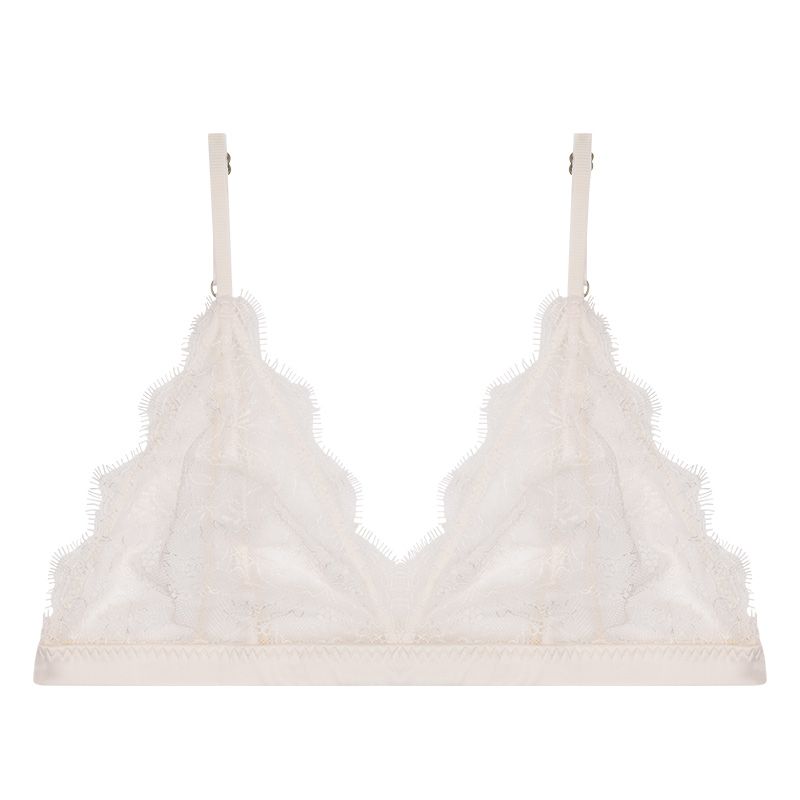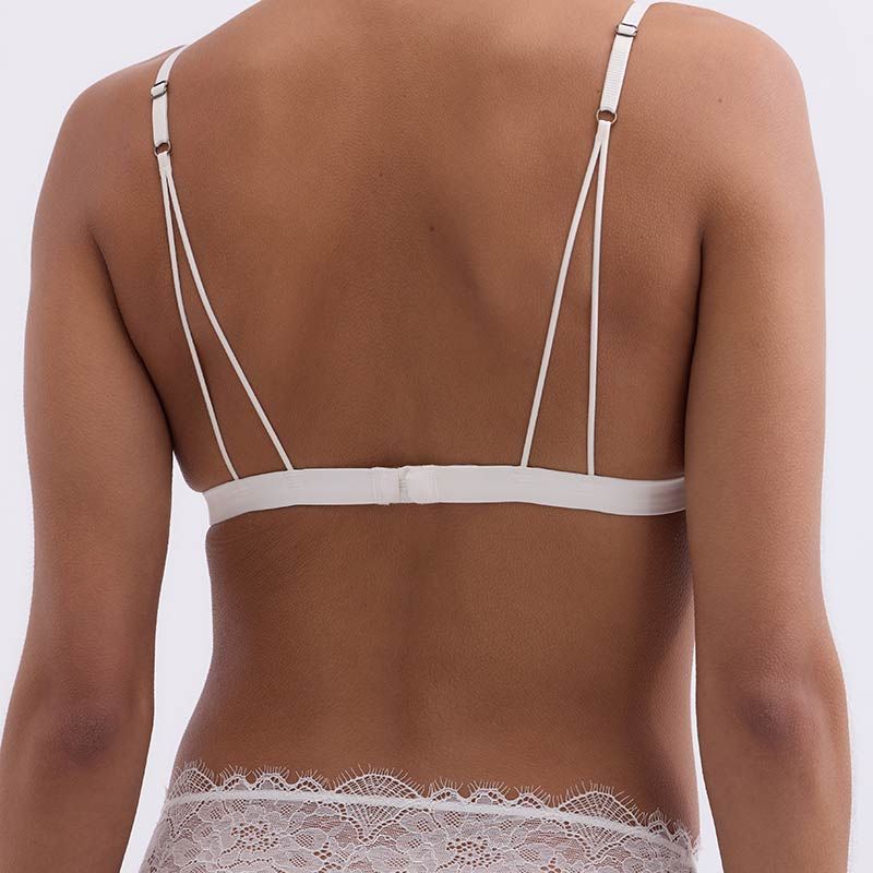Triangolino in delicato pizzo Gwen in bianco.Questo reggiseno senza imbottitura ti dà un sostegno leggero.