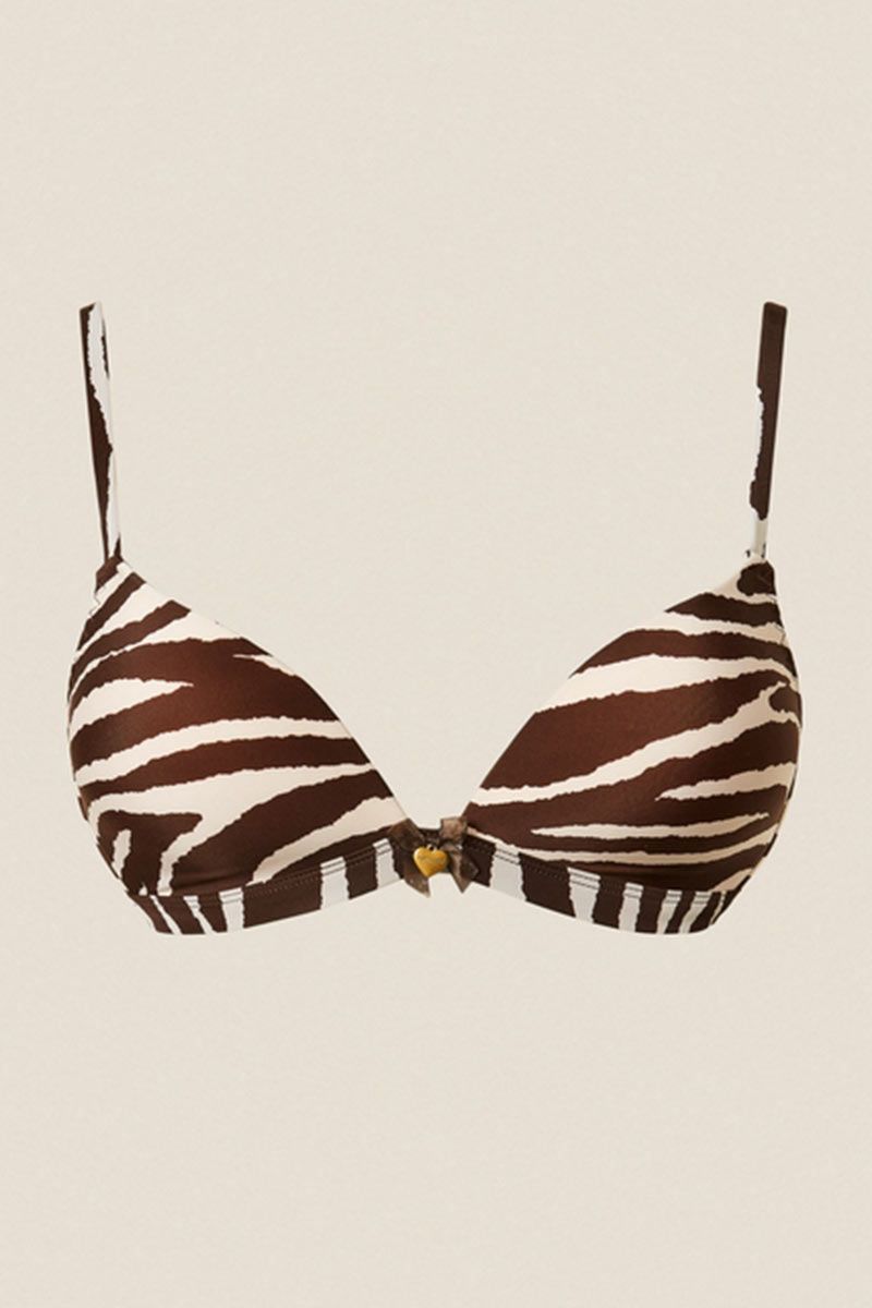Reggiseno a triangolo in charmeuse stampata a fantasia animalier. È imbottito con coppe fisse e ha stecche laterali, spalline ricoperte davanti e in elastico regolabile logato sul retro, chiusura a due ganci, fiocco in organza e logo a cuore in metallo al centro delle coppe.